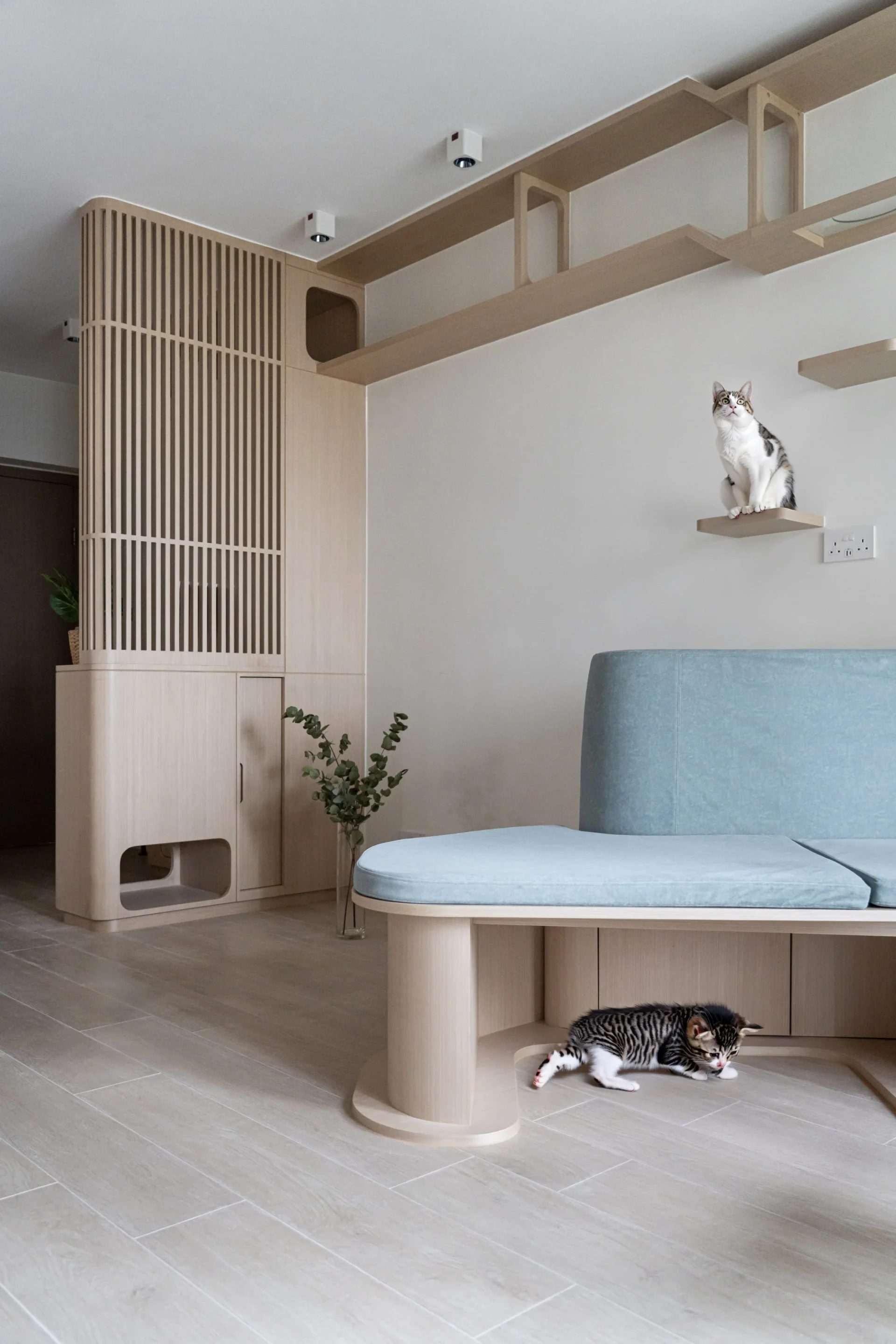Tailoring storage cabinets to specific household needs is another effective strategy. For pet owners, careful planning ensures harmony. Karr Yip of ADO has designed sofas with scratch-resistant fabrics and cut-outs for cats, as well as shelves that double as jumping platforms. Alvin Cheng of MAD Studio created a dedicated space for a dog in the living room cabinetry of a 650 sq ft flat, integrating the pet’s needs seamlessly into the overall design.