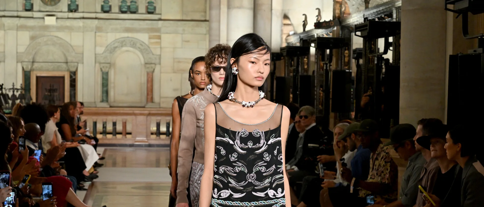 Tory Burch presented her Spring 2026 collection at New York Fashion Week on Monday, unveiling designs she described as a reflection of “the complexity of women and the different facets of their style.” The runway took place inside a striking Romanesque-Revival space, once the headquarters of a bank and now home to luxury condominiums, giving the show a dramatic and historic backdrop. Among the guests seated front row were Lily Collins, Jessica Alba, and Emma Roberts, who added to the glamour of the event.